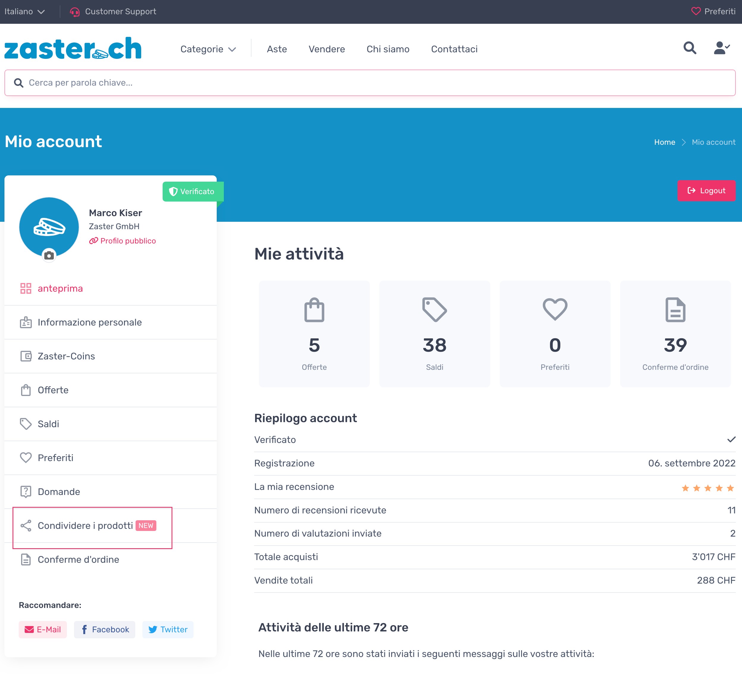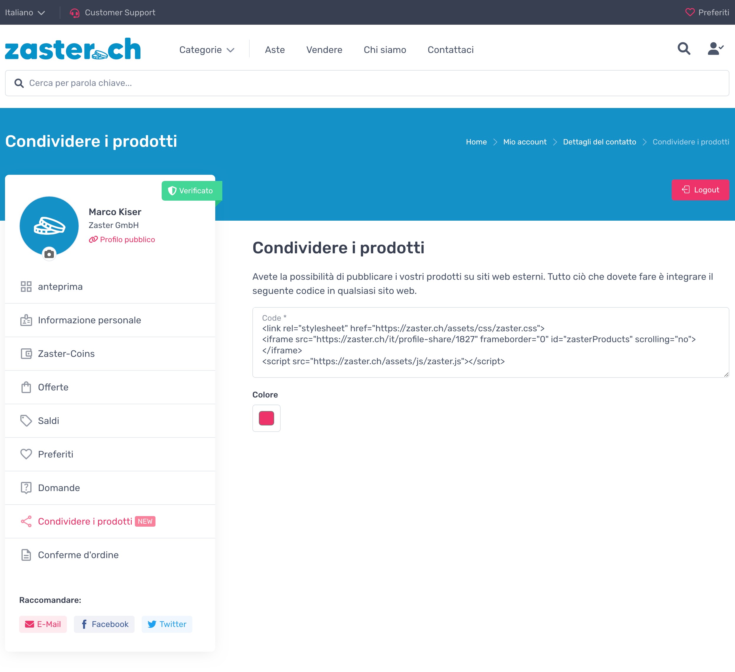 Dopo aver inserito il codice, il vostro assortimento sarà visualizzato sul vostro sito web allo stesso modo della pagina del vostro profilo personale su zaster.ch. Per abbinare il colore del layout al vostro sito web, potete selezionare il colore desiderato nel vostro profilo.